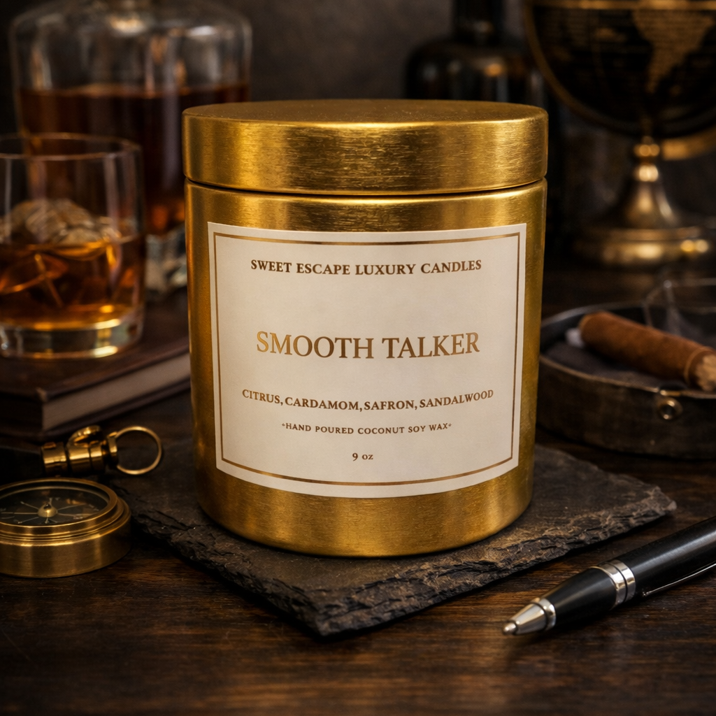 Step into the room and own it. Smooth Talker is bold yet refined—a candle for the man who knows his presence leaves an impression. Crisp citrus sparks the senses, warming into the exotic spice of cardamom and the golden allure of saffron, all grounded by the deep, creamy richness of sandalwood.